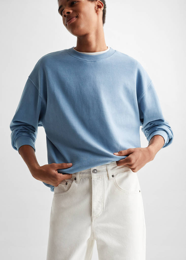 Denim style cotton fabric. Comfy-fit. Regular fit. Tapered fit: wide cut at the top that narrows from the knee to the ankle. Medium waist. Medium. Standard design. Five pockets. Loops. Zip and one button fastening. The model is 180 cm and is wearing a size M