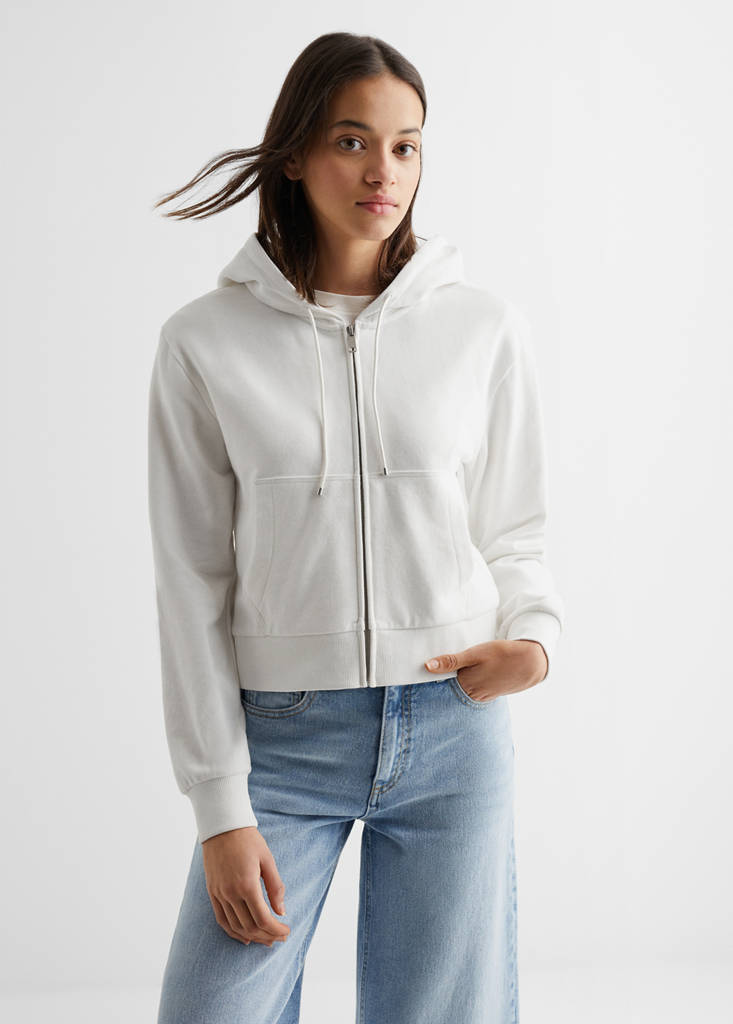 Cotton-blend fabric. Medium. Straight design. Front closure. Zip fastening. Two front pockets. Cropped design. Oversize design. Hood. Long sleeve. The model is 172 cm tall and is wearing a size M