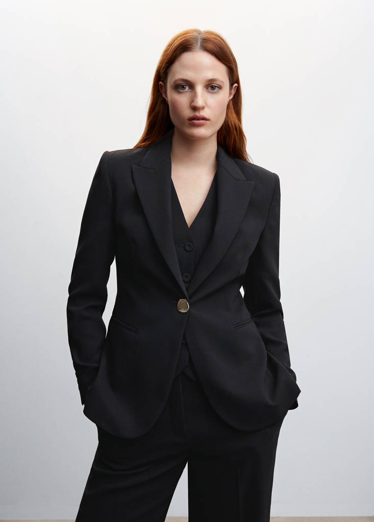 Flowy fabric. Straight design. Lapel-collar V-neck collar. Long sleeve with buttoned cuffs. Shoulder pad. Button fastening on the front. Decorative button. Back-slit hem. Inner lining. Co-ord. Plus Size Available. Party and events collection