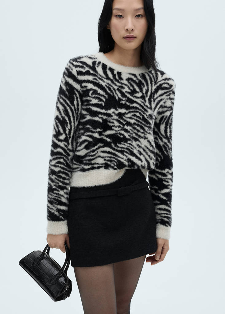 Knit fabric. Faux fur effect. Straight design. Round neck. Long sleeves. No Fastening. Zebra design