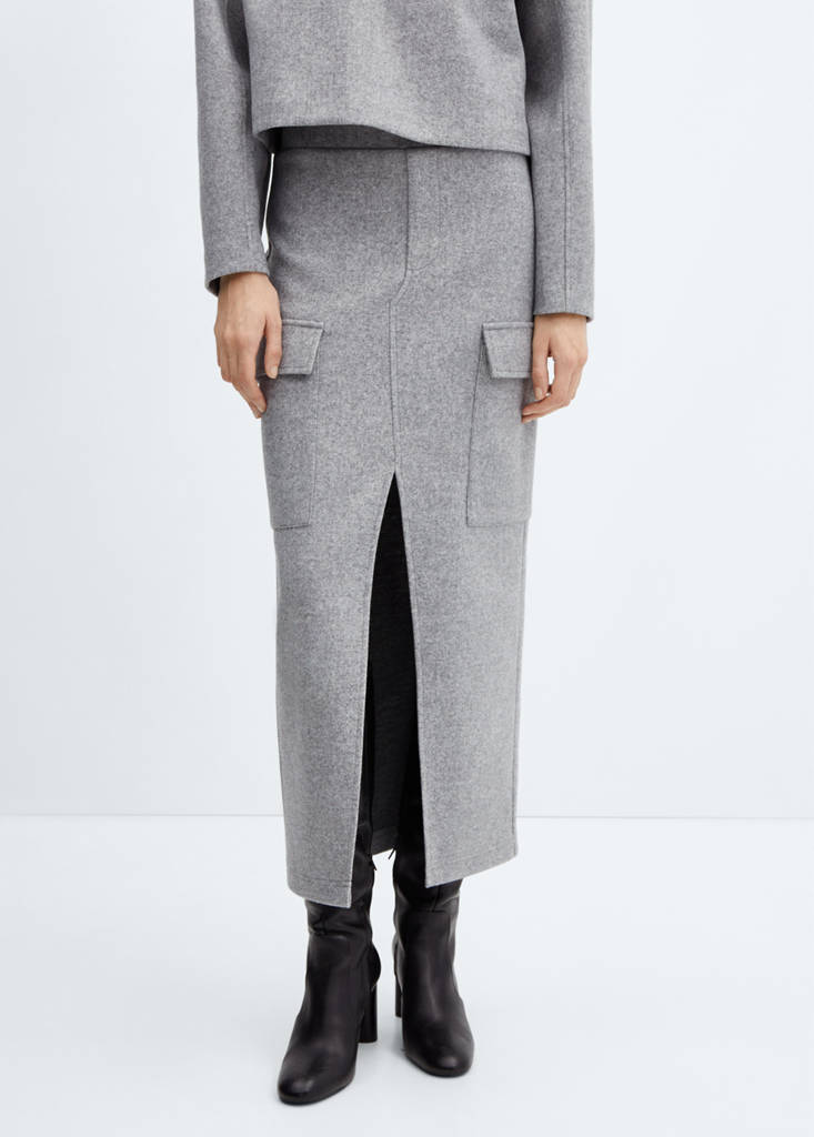 Knit fabric. Cargo design. Long design. Straight design. Elasticated waistband. Two side pockets with flaps. Opening in the lower front. Total look. Office looks