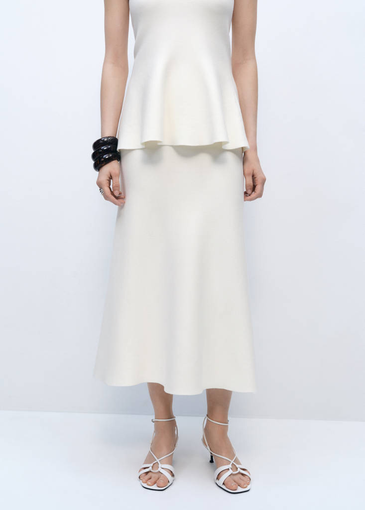 Fine knit fabric. Peplum design. Midi design. Mid-rise. Elasticated waistband. No Fastening. Total look. This garment belongs to our event collection, designed to make you the perfect guest at any party, wedding or ceremony