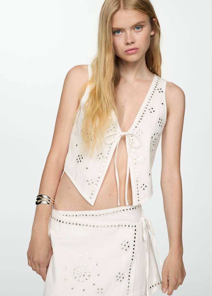 Cotton and linen blend fabric. Short design. Straight design. Side bow fastening. Rhinestone detail. Inner lining