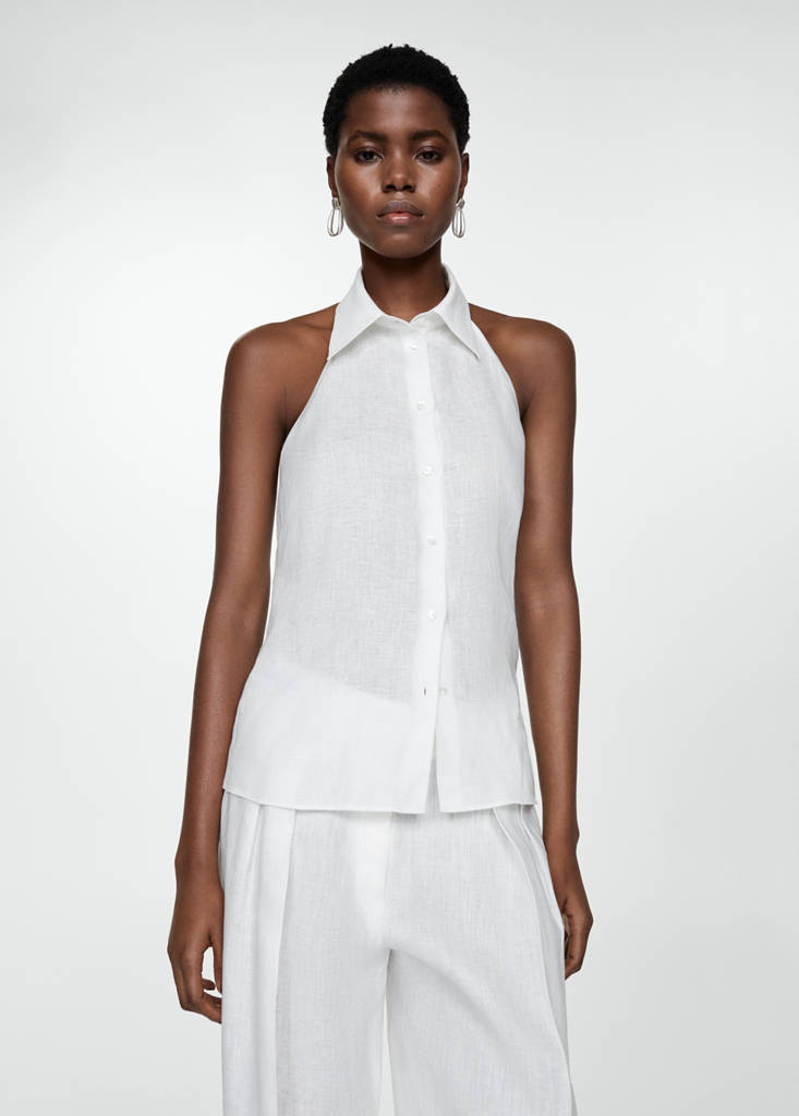 100% linen fabric. Straight design. Halter neck. Shirt collar. Open back. Sleeveless. Selection Collection. Front closure with buttons
