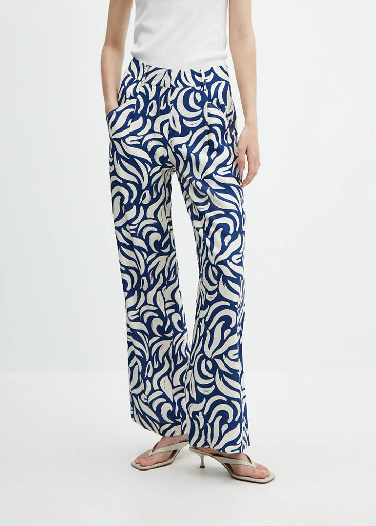 Fluid fabric. Long design. Wide-leg design. Belt loops. Two side pockets. Concealed button, hook and zip fastening. Dart detail. Total look. Printed design