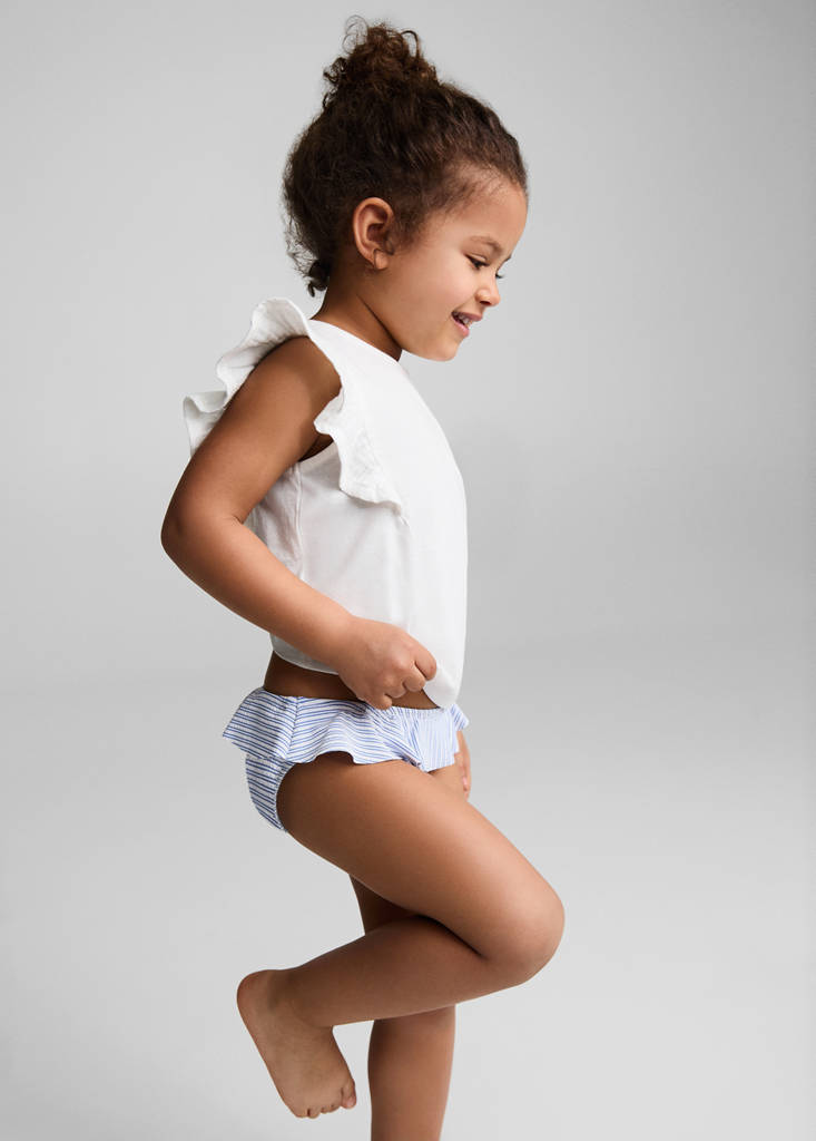 Swimwear collection. Striped print. Ruffled design. Classic design. Classic panty. Elasticated waistband. No Fastening. This product is available in the Kids Girl colection