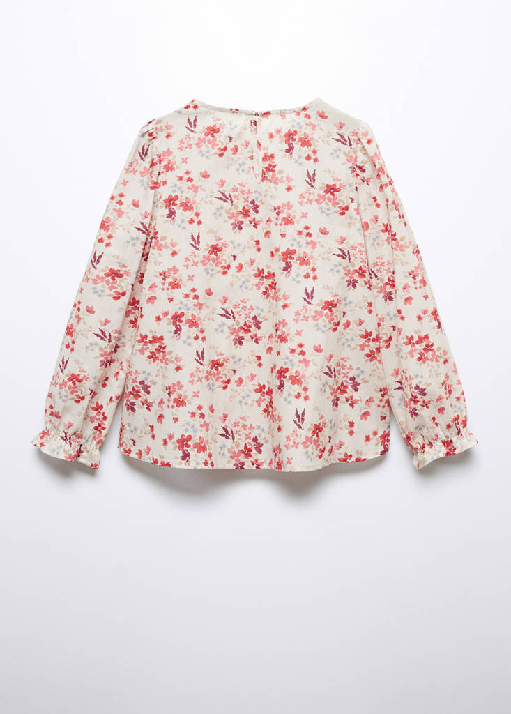 Straight design. Flowers print. Round neck. Long sleeves. Button closure. Ruched detail on the cuffs