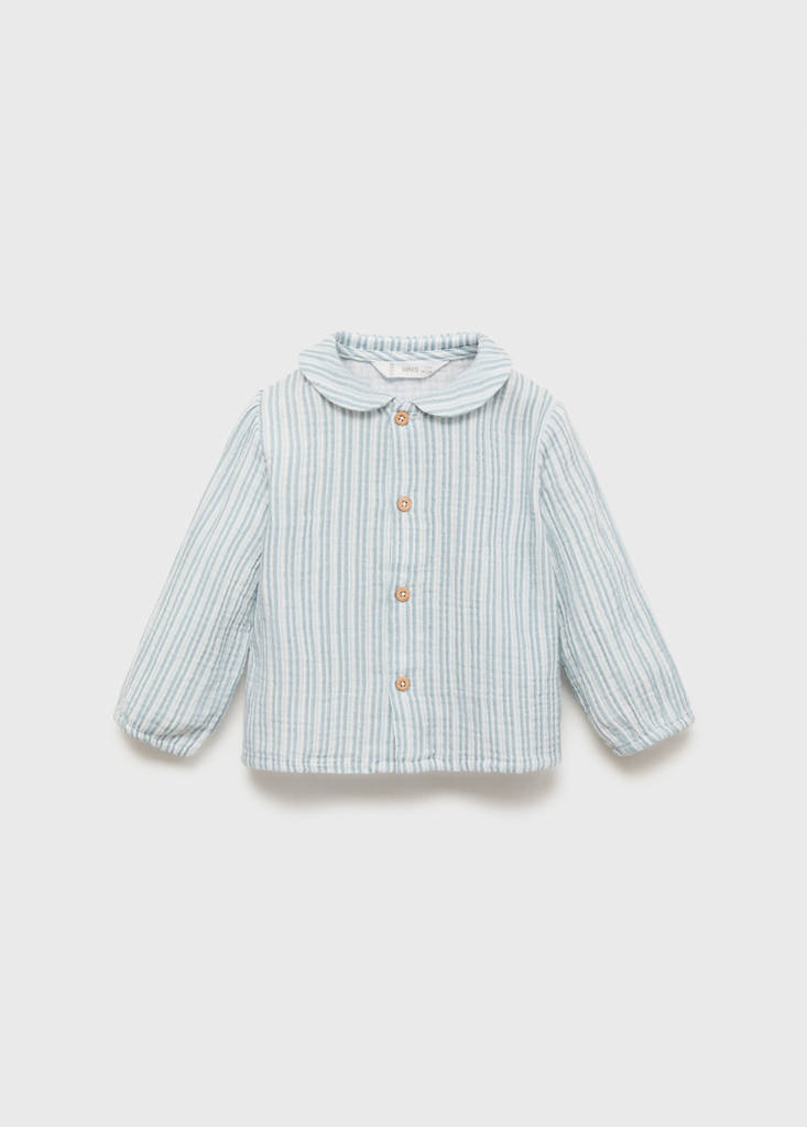 100% cotton fabric. Straight design. Striped design. Peter Pan collar. Long sleeves. Front closure with buttons
