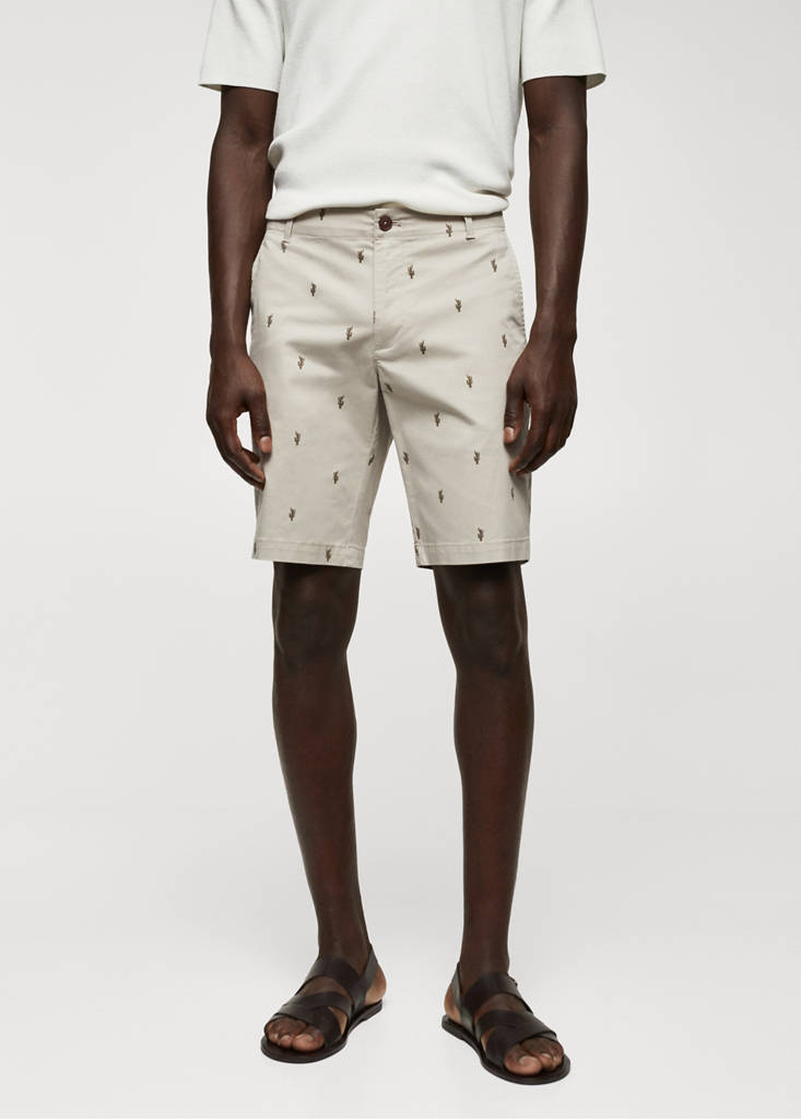 Slim fit. Slightly elastic cotton fabric. Micro print. Zip and button fastening. Belt loops. Two front pockets. Two welt pockets with button at the back