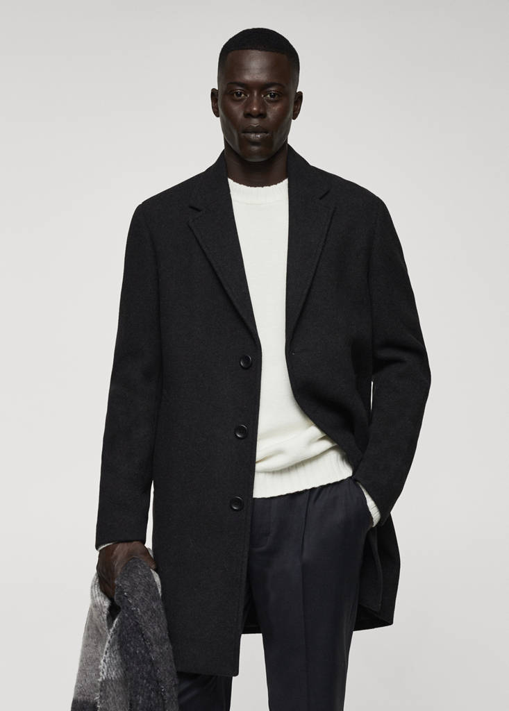 The grey and blue models are online exclusives. Recycled wool mix fabric. Slim fit. Heavy structure. Straight design. Medium length. Notch lapels and buttonhole. Two side pockets. Back vent at the hem. Inner lining. Interior pocket. Front closure with buttons. Long buttoned sleeves. Front closure. Peak lapel. Long sleeves. Lining only. Medium design
