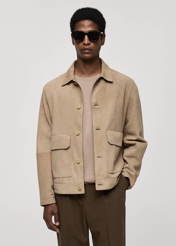 100% suede leather. Shirt collar. Button fastening at the front. Two flap and patch pockets on the front. Long sleeves. Straight hem