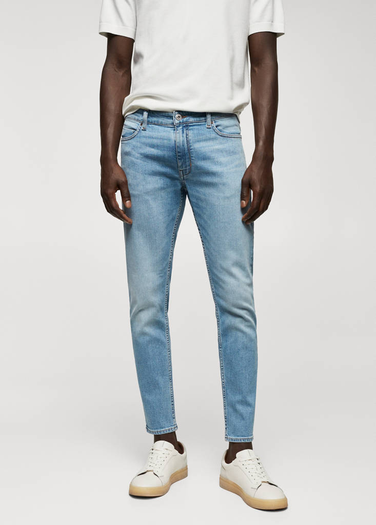 Tapered fit: wide cut at the top that narrows from the knee to the ankle, cotton and lyocell blend fabric, dark grey wash, belt loops, zip and one button fastening, five pockets, crop style, the model is wearing a size 42, denim jeans style.