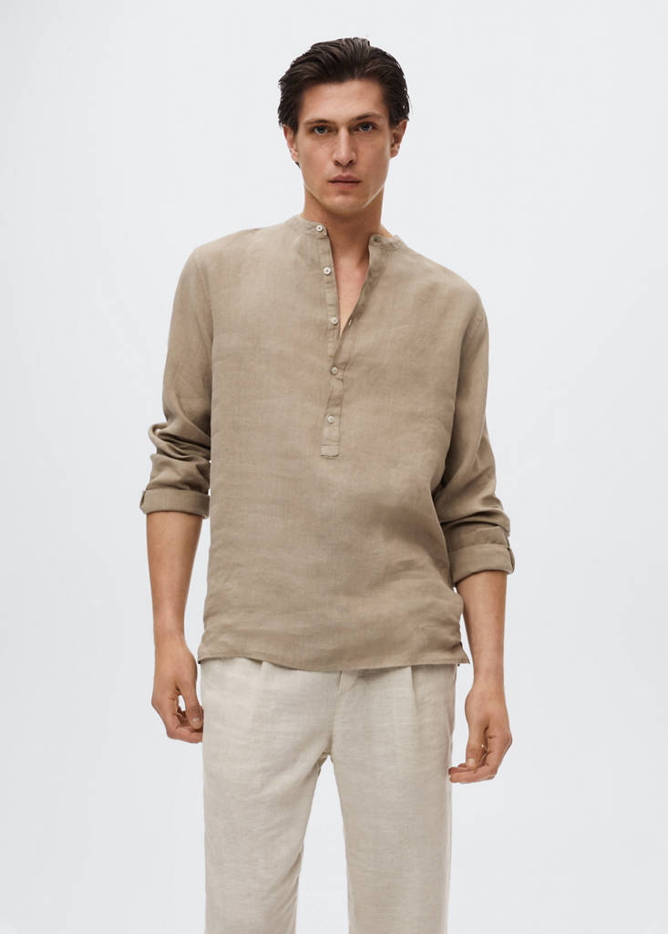 Regular-fit Mao-collar linen shirtPrice historyInitial price struck through [€ 49.99 ]€ 49.99Current price [€ 38.99 ]€ 38.99-22%Select a colourMedium BrownSelect your sizeSNot available. I want it!MNot available. I want it!LNot available. I want it!XLNot available. I want it!DimensionsNotify meRegular fit. Linen fabric. Mao neckline. Long sleeve with buttoned cuffs. Flap cover with button fastening. The model is 187 cm tall and is wearing a size MDetails, composition and careStore availability