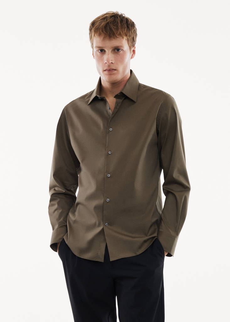 Performance Collection. Easy iron. Comfort Stretch: Stretch fabric for added comfort. Regular fit. Slightly elastic cotton fabric. Long sleeves with buttoned cuffs. The ink blue and beige models are online exclusives. The maroon model is an online exclusive. Classic collar. Rounded base. Comfort: Horizontal and vertical stretch fabric for added comfort. Front closure with buttons. Slim fit