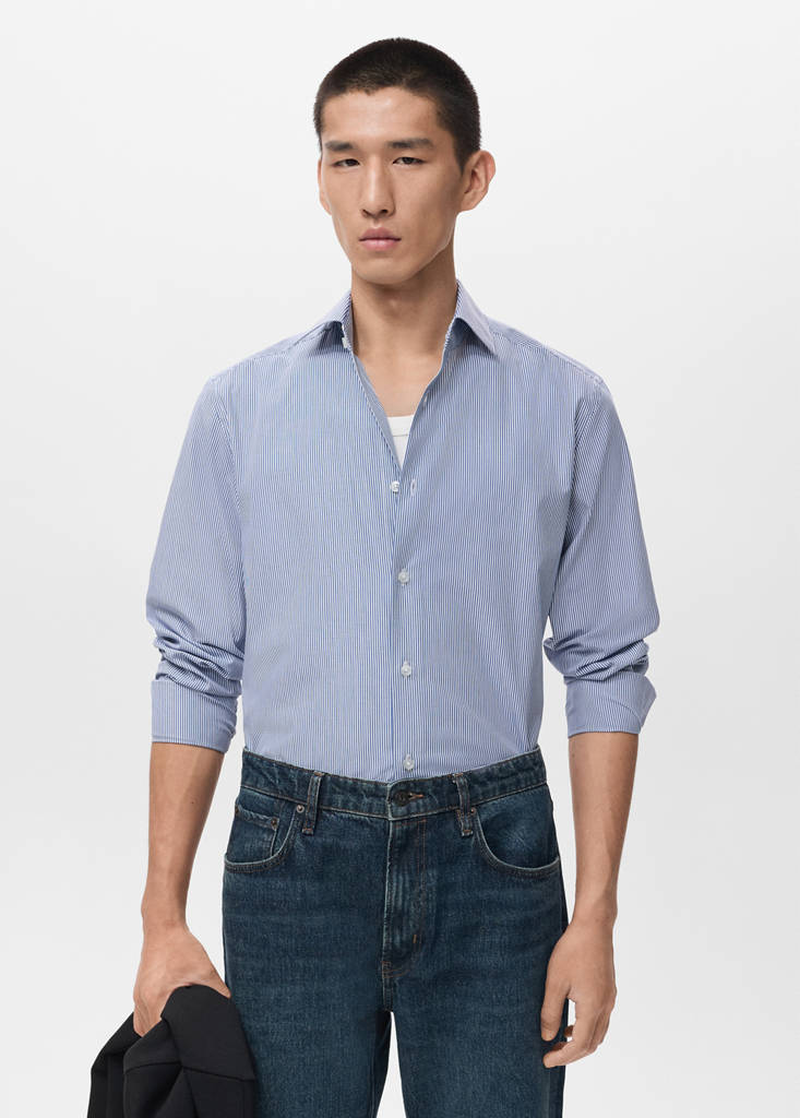 Slim fit. 100% cotton fabric. Striped design. Lightweight fabric. Shirt-style V-neck collar. Long sleeves. Rounded base. Front closure with buttons