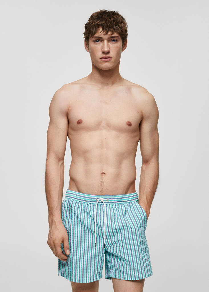 Elastic waist with adjustable drawstring. Vertical striped print. Two front pockets. Back patch pocket with Velcro