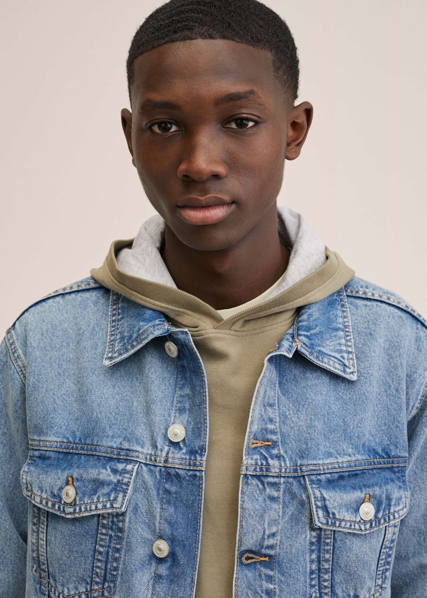 Sustainable cotton fabric. Denim fabric. Medium design. Straight design. Classic collar. Long sleeve with buttoned cuffs. Two button patch pockets on the front. Two side pockets. Button fastening on the front section. The model is 187cm tall and is wearing a size L. Fits bigger to size. Teen collection.