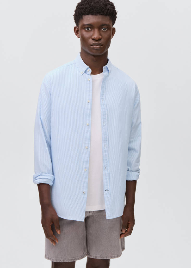 100% cotton fabric. Striped fabric. Oxford style. Straight design. Shirt collar with button. Long sleeves. Buttoned cuffs. Front closure with buttons