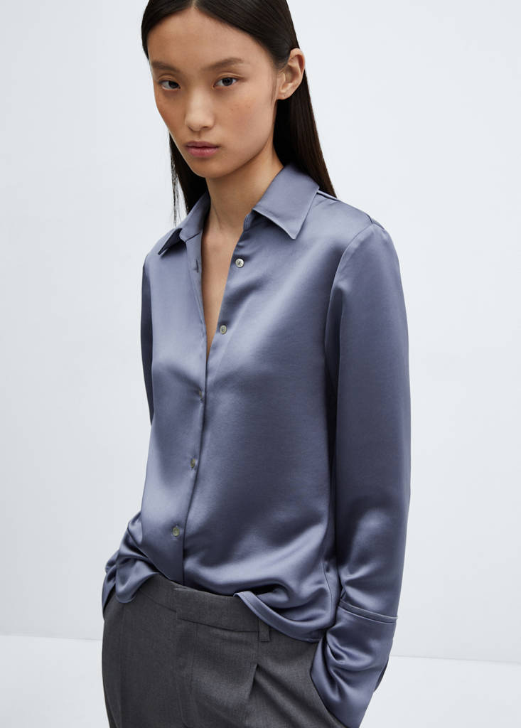 Fluid fabric. Satin fabric. Straight Design. Shirt collar. Long sleeves. Office looks. Front closure with buttons