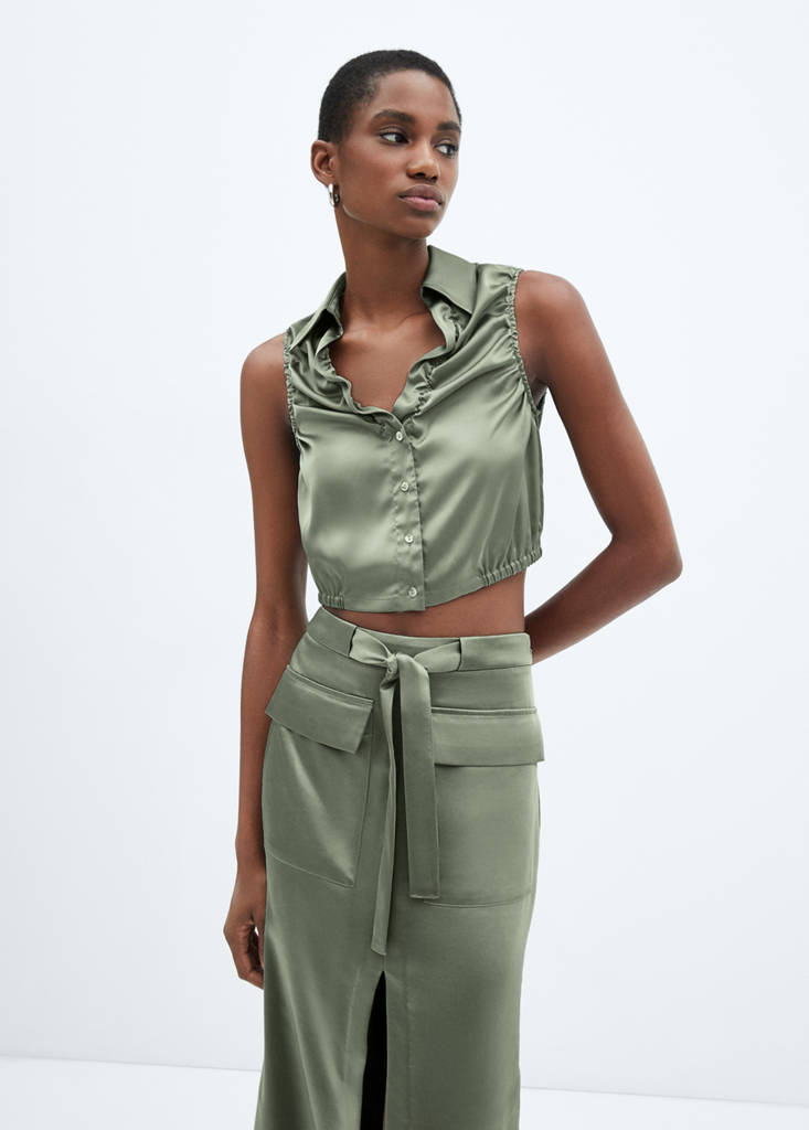Satin fabric. Fluid fabric. Short design. Straight design. Total look. Shirt collar. Sleeveless. Hem with elastic band. Ruched details. Front closure with buttons