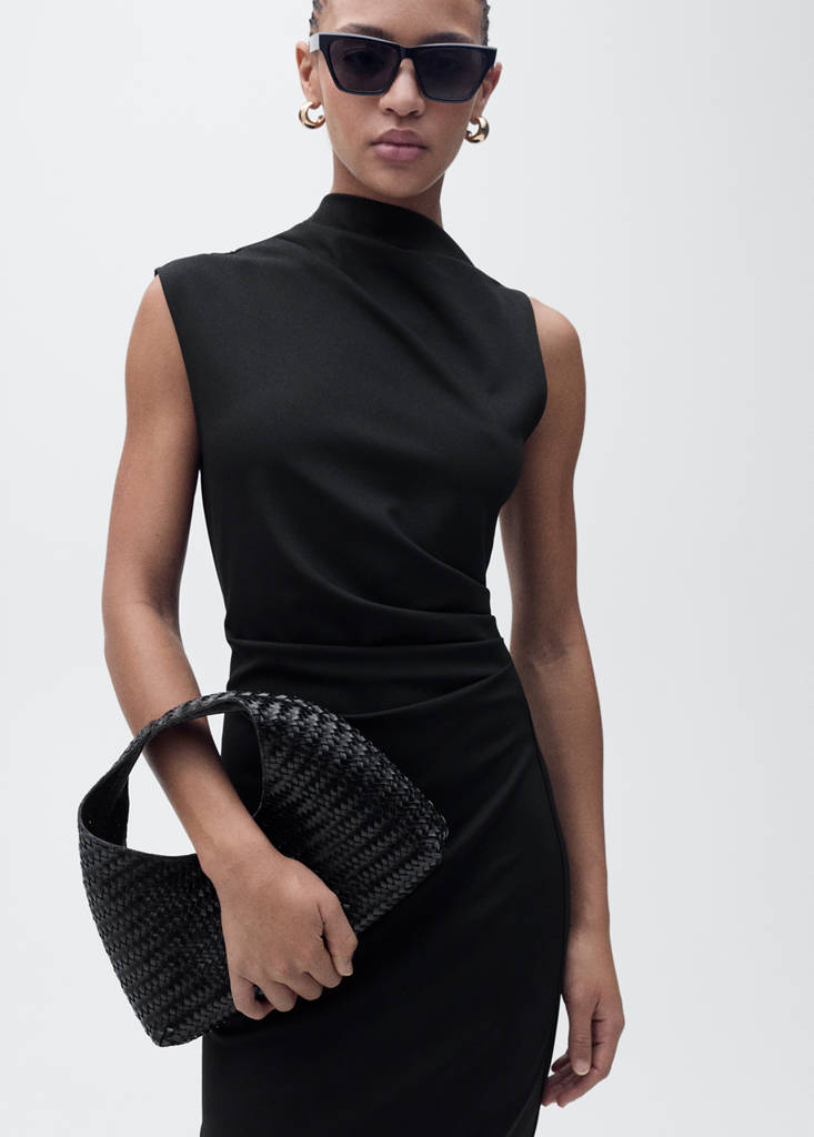 Fitted design. Midi design. Asymmetrical neckline. Sleeveless. Draped waist. No Fastening