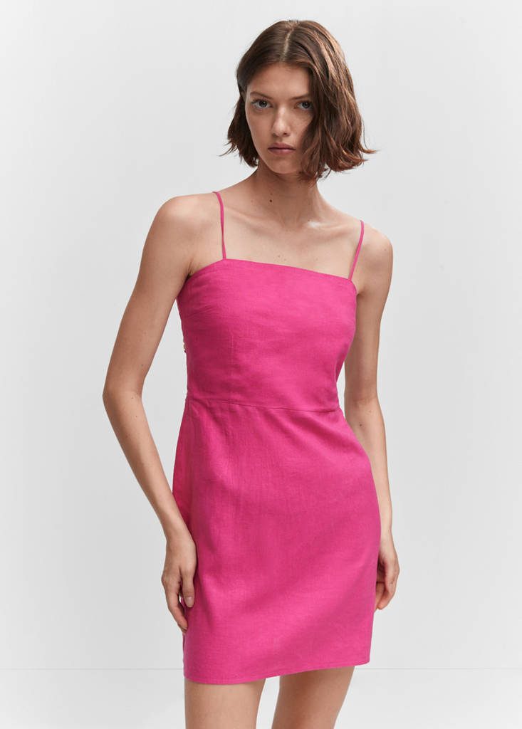 Linen mix. Straight design. Short design. Straight collar. Thin-straps with bow closure. Side zip fastening. Beaded detail. Festival Season. Office looks