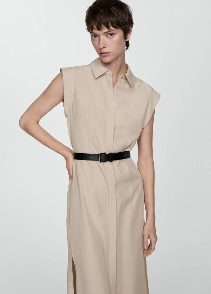 Linen and lyocell blend fabric. Midi design. Straight design. Shirt collar. Short sleeves. Hem with side slits. Adjustable belt. Front closure with buttons