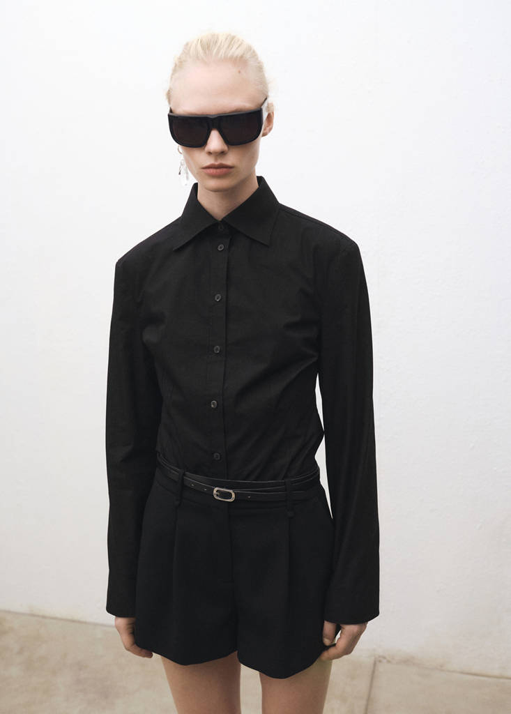 Viscose-blend fabric. Suit style. Mini design. Straight design. Mid-rise. Belt loops. Two side pockets. Dart detail. Button, hook and zip front closure. Inner lining. Total look. Selection collection