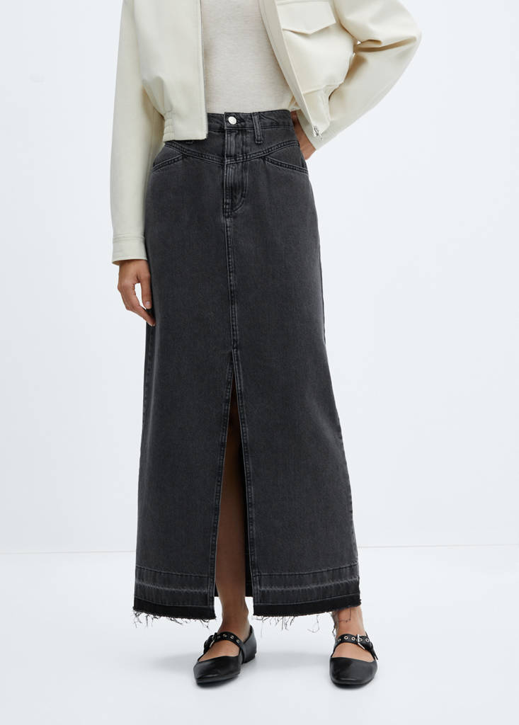 Denim style cotton fabric. Recycled cotton-blend fabric. Long design. Straight design. Two front pockets. Two patch pockets on the back. Zip and one button fastening. Loops. Decorative seams. Opening in the lower front. Frayed hem. Festival Season