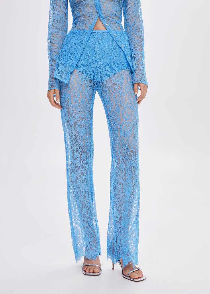 Cotton blend fabric. Embroidered fabric. Palazzo design. Long design. High waist. Side zip fastening. Scalloped hem. Total look. Party, ceremony and communion collection