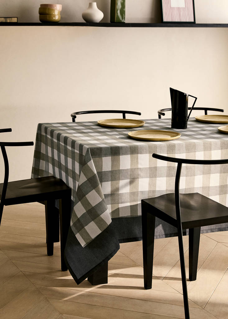 100% cotó. Mida: 150x150 cm. De 2 a 4 comensals. Estampat de quadres. Elegant per a qualsevol tipus d'ocasió