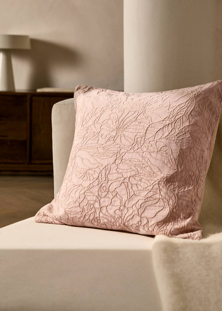 Mida: 50x50 cm. Teixit jacquard. Disseny reversible, cara frontal jacquard floral, i cara posterior preval el toc vellutat. Tanca cremallera invisible al lateral. Crea un ambient càlid i agradable. Ideal per a afegir un toc sofisticat i neutre al teu saló. Disponible en diversos colors. Disponible en dues mides. Combina amb més articles de la col·lecció