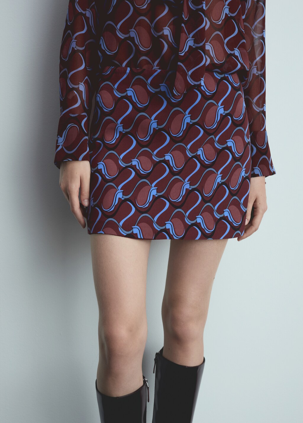 Teixit fluid. Disseny curt. Disseny recte. Disseny estampat. Tanca de cremallera invisible a la part posterior. Total look. La model mesura 1,78 i porta una talla S/36.