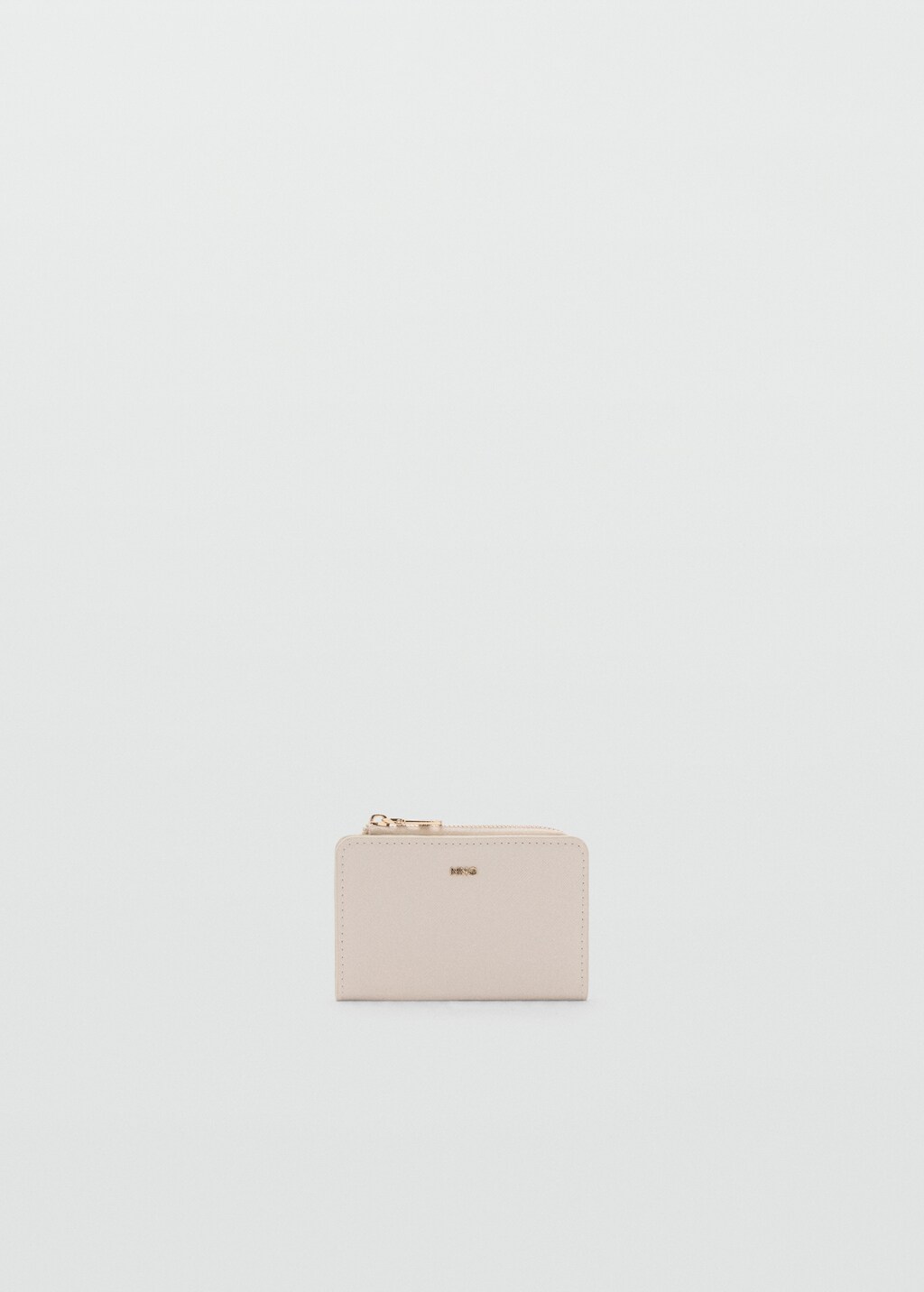 Mida petita. Disseny quadrat. Efecte pell. Múltiples ranures per a targetes. Butxaca cremallera exterior. Tancament de botó a pressió. Efecte safiano. Tanca de cremallera. Tancament metàl·lic a pressió. Logotip en relleu. Costures decoratives.