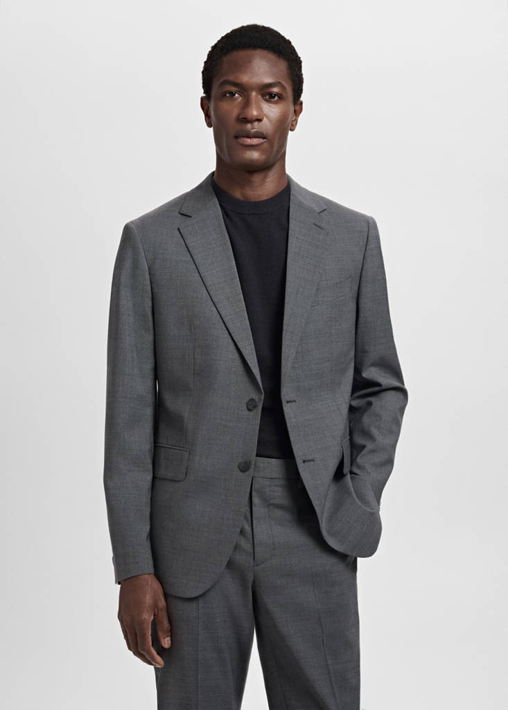 Slim fit. Teixit 100% llana verge. Folre interior. Coll solapa amb trau. Butxaca de rivet al pit. Dos butxaques de trau davanteres. Dues obertures a la part posterior del baix. Punys amb botons decoratius