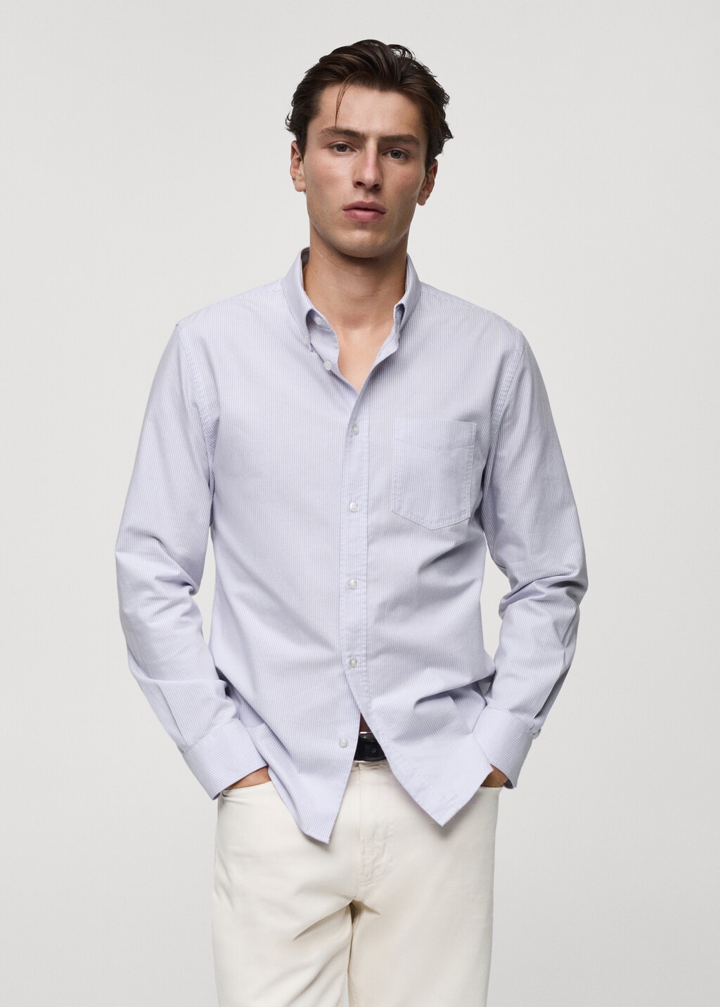 Tallatge regular. Disseny de ratlles kodak. Coll americà botonat. Butxaca de pedaç al pit. Màniga llarga amb punys botonats. El color blanc és exclusiu en línia. Teixit 100% cotó. Vora arrodonida. Tancament davanter amb botons.