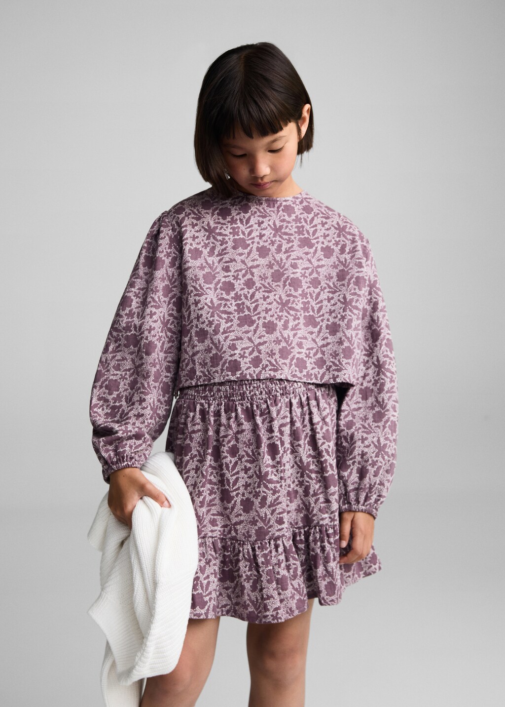Col·lecció Vuelta al cole. 100% cotó. Estampat floral. Disseny recte. Coll rodó. Màniga llarga. Obertures laterals amb cordill ajustable. Tancament de botó a la part posterior.