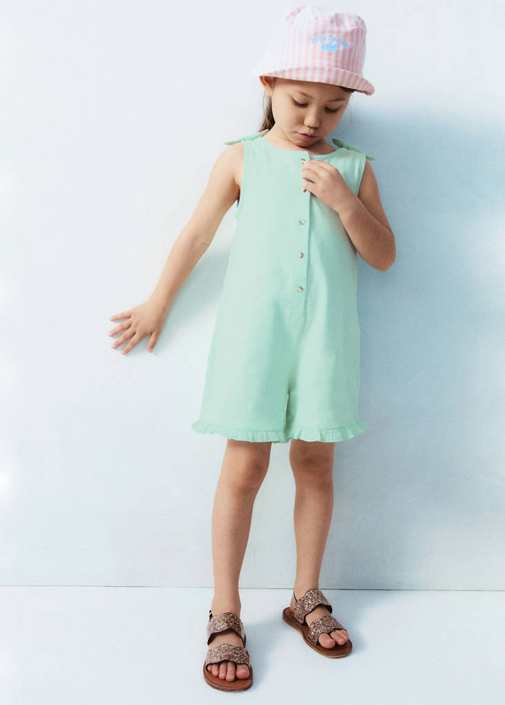 100% Algodón. Diseño recto. Diseño corto. Tirantes anchos. Botones efecto carey. Detalle de lazo en el hombro. Bajo con volante. Cuello redondo. Sin mangas. Cierre delantero