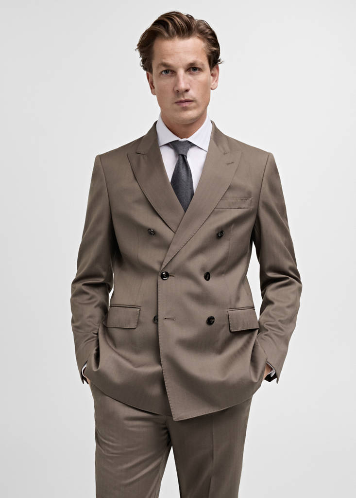 Slim fit. Tejido 100% lana virgen italiana. Cuello solapa lanza. Estructura de espiga. Cierre delantero con botones cruzados. Bolsillo de ribete en el pecho. Dos bolsillos delantero de ribete y solapa. Manga larga con puños abotonados. Doble abertura posterior en el bajo. Forro interior. Bolsillo interior