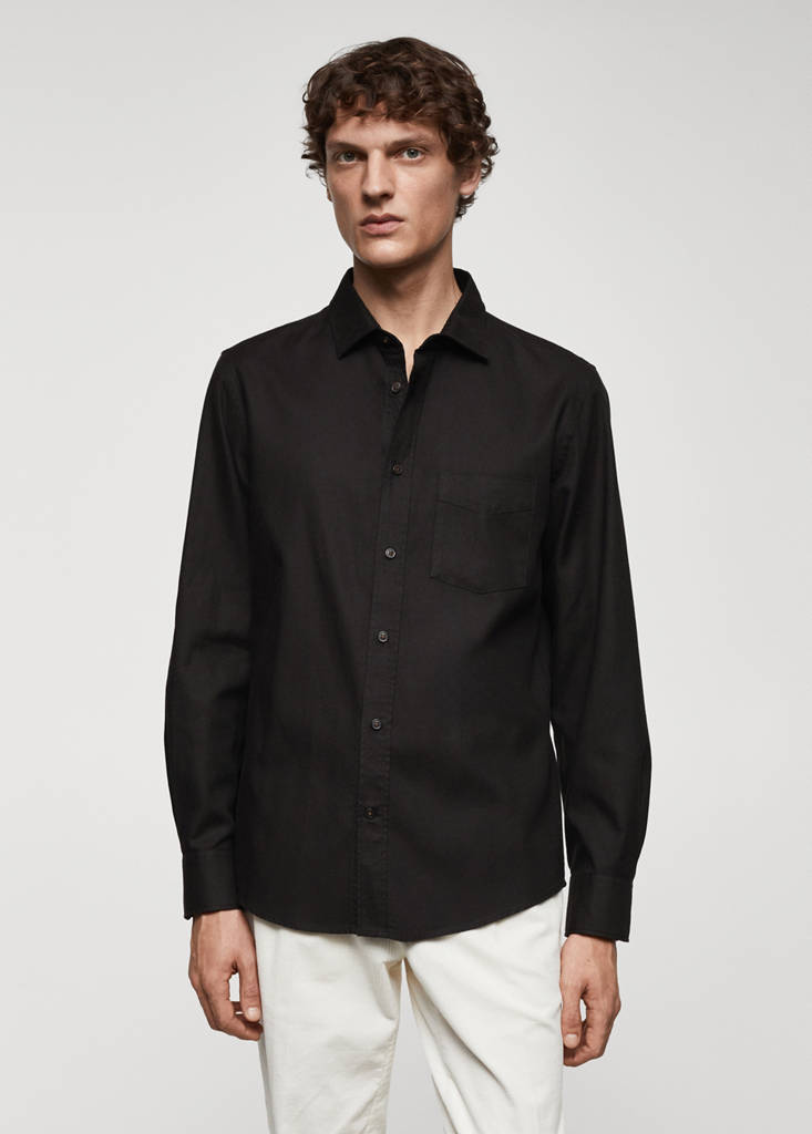 Regular fit. Tejido mezcla algodón y lyocell. Sarga algodón perchado. Cuello camisero. Bolsillo de parche en el pecho. Manga larga con puños abotonados. Bajo redondeado
