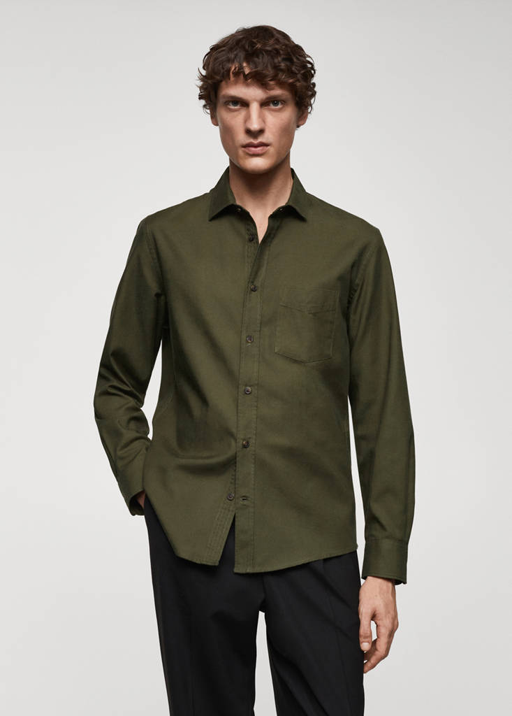 Regular fit. Tejido mezcla algodón y lyocell. Sarga algodón perchado. Cuello camisero. Bolsillo de parche en el pecho. Manga larga con puños abotonados. Bajo redondeado