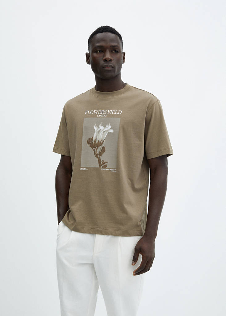 Slim fit. Cuello redondo acabado rib. Manga corta. Dibujo estampado en la parte delantera. Bajo recto con detalles pespunteados. Tejido 100% algodón