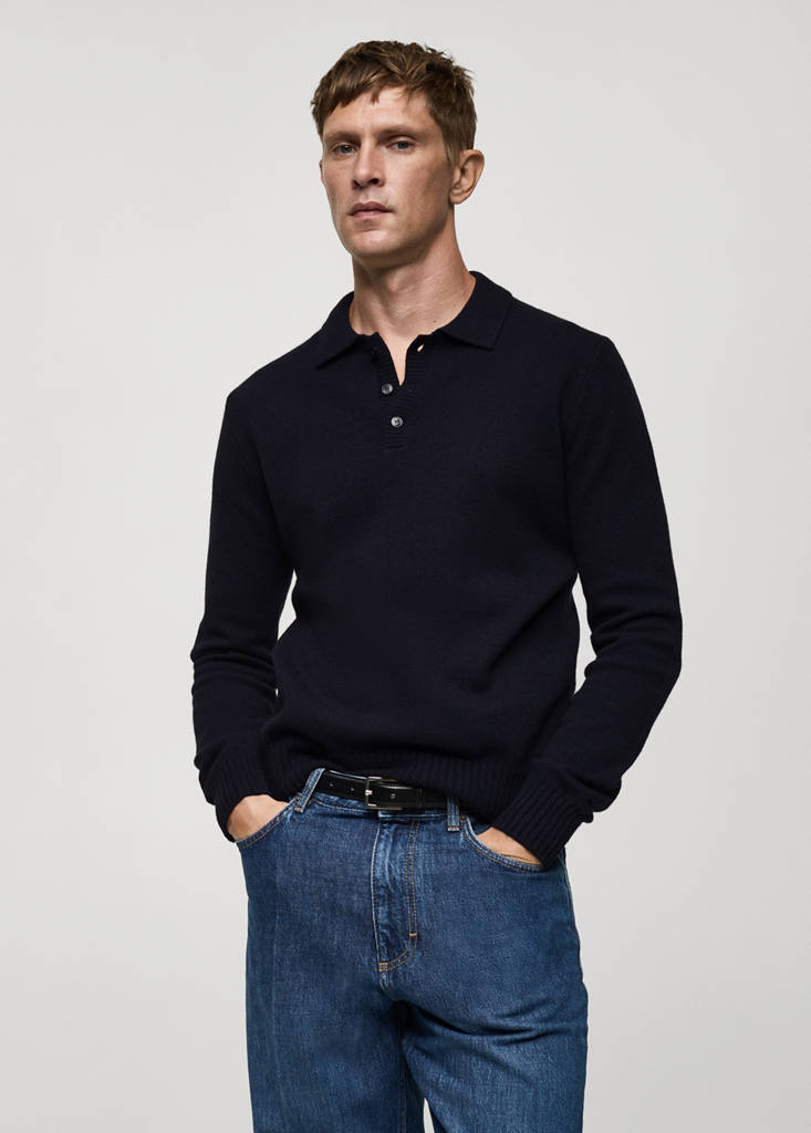 Tejido mezcla de lana. Regular fit. Tejido de punto medio. Cuello polo con cierre de botones. Manga larga. Bajo recto. Terminaciones de canalé en cuello, manga y bajo