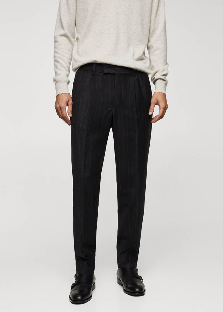Es una reformulación del pantalón clásico de pinzas en un tejido 100% de lana virgen. Con un discreto estampado de raya diplomática y un corte relajado. Confeccionado 100% en lana italiana de la prestigiosa casa textil Marzotto Tessuti. De corte slim fit, destaca por un elegante acabado que rejuvenece el corte clásico de su diseño. Slim fit. Tiro medio. Detalle de pinzas delanteras. Cierre oculto de botón, gancho y cremallera. Trabillas para cinturón. Dos bolsillos delanteros. Dos bolsillos con botón en la parte posterior. Detalle de raya planchada en la parte delantera y trasera