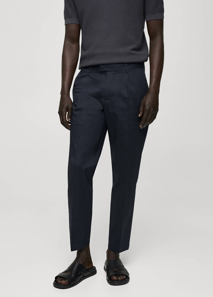 Slim fit. Tiro medio. Tejido mezcla de algodón. Detalle de pinzas delanteras. Abertura posterior. Trabillas para cinturón. Cierre delantero de doble botonadura y cremallera. Dos bolsillos delanteros. Dos bolsillos de ribete con botón en la parte posterior. Detalle de raya planchada en la parte delantera y trasera. Detalle de pinzas. Cierre doble botón y cremallera. Tejido mezcla de lana. Diseño largo. Manga abotonada. Solapas con muesca. Dos bolsillos de solapa en la parte frontal. Cierre de botones. Forro interior. Bolsillo interior