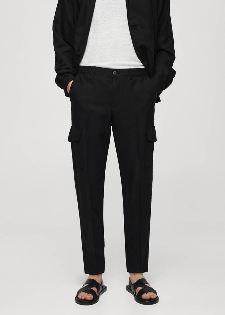 Conjunto disponible como total look. Slim fit. Tejido mezcla de lino. Trabillas para cinturón. Cierre de cremallera y botón. Dos bolsillos delanteros. Dos bolsillos de parche laterales. Dos bolsillos de parche con botón en la parte posterior. Detalle de raya planchada en la parte delantera y trasera