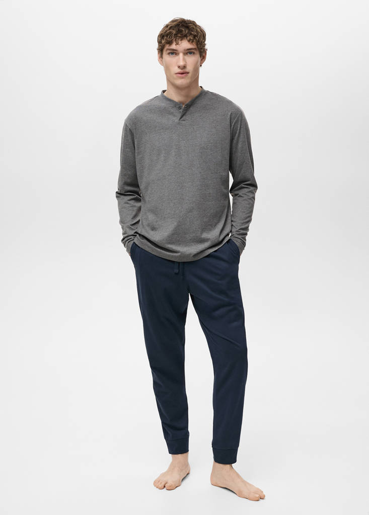 Tejido 100% algodón. Camiseta de manga larga y pantalón largo con goma en la cintura y cordón ajustable. Incluye una bolsa para guardar las prendas