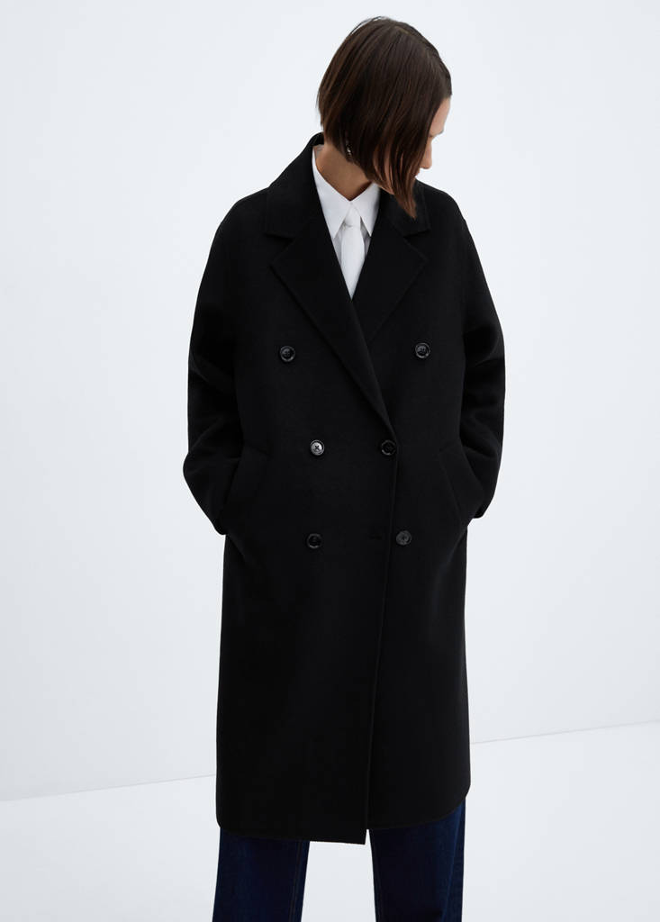 Tejido con lana. Handmade. Diseño doble botonadura. Diseño oversize. Diseño largo. Cuello pico con solapa. Solapas con muesca. Manga larga. Costura del hombro caída. Dos bolsillos laterales. Cierre de doble botonadura. Abertura posterior en el bajo. Looks de oficina. Tejido con lana reciclada. El color negro es exclusivo online