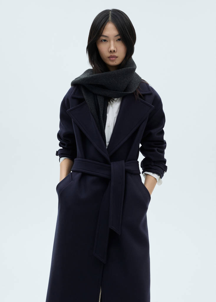 Tejido mezcla de lana virgen. Diseño oversize. Diseño largo. Cuello pico. Solapas con muesca. Manga larga. Trabillas en los puños. Cinturón de batín. Forro interior. Cierre delantero con botones