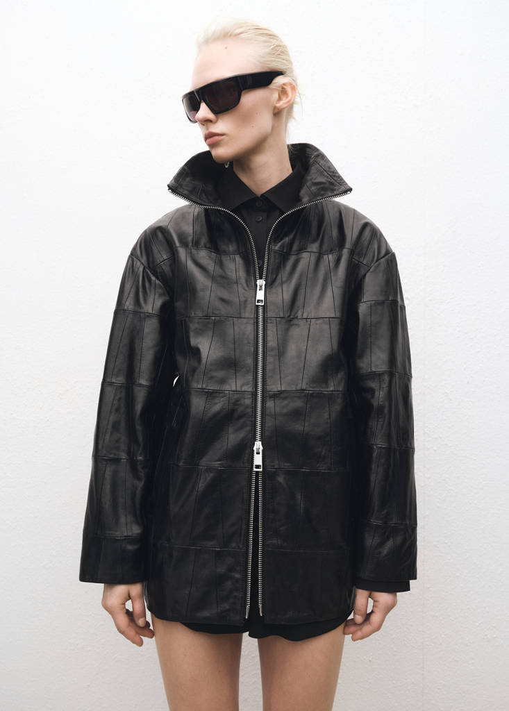 100% piel ovino. Diseño patchwork. Diseño oversize. Cuello alto. Manga larga. Dos bolsillos laterales. Cierre delantero con cremallera. Forro interior. Colección Selection